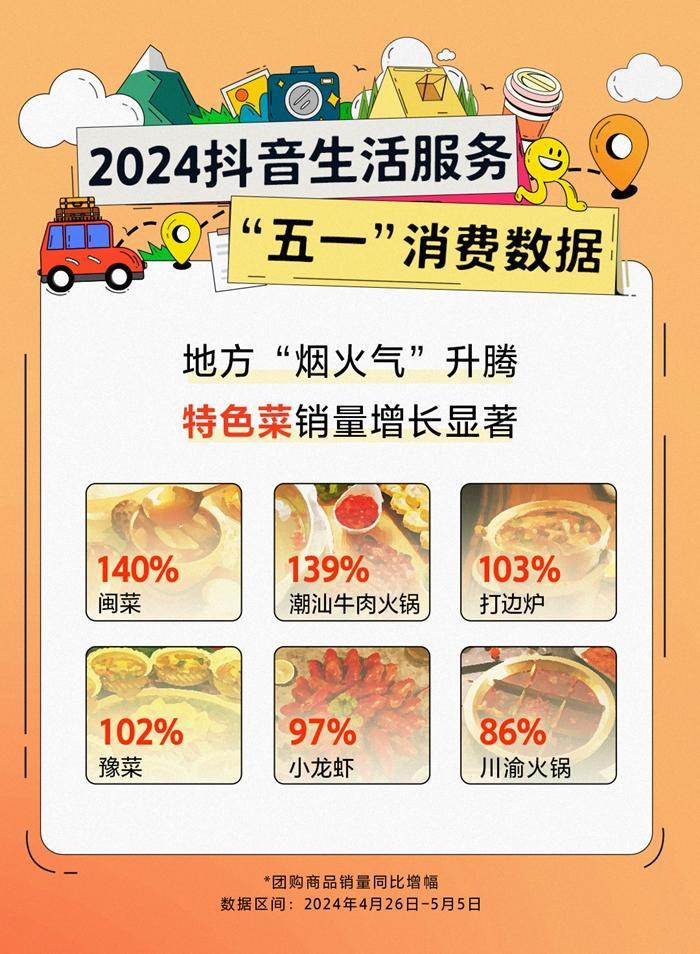 名所舊跡を巡れば、各地の特色あるグルメも食べたくなるということで、同連休中は抖音プラットフォームの飲食消費(fèi)も非常に活発だった。データを見ると、4月26日から5月5日までの間に、中國8大料理の1つである閩菜(福建料理)の共同購入売り上げは同140%増加し、名物の潮汕牛肉火鍋の売り上げが同139%増加したほか、広東式火鍋の「打辺爐」もグルメの間で人気が高く、共同購入売り上げは同103%増加した。河南省の文化観光の人気が続き、豫菜(河南料理)もより多くの消費(fèi)者の視野に入るようになり、抖音での共同購入売り上げが同102%増加した。またザリガニや四川火鍋などの休日グルメの「定番」も高い成長率を維持した。ザリガニは同97%増、四川火鍋は同86%増だった。