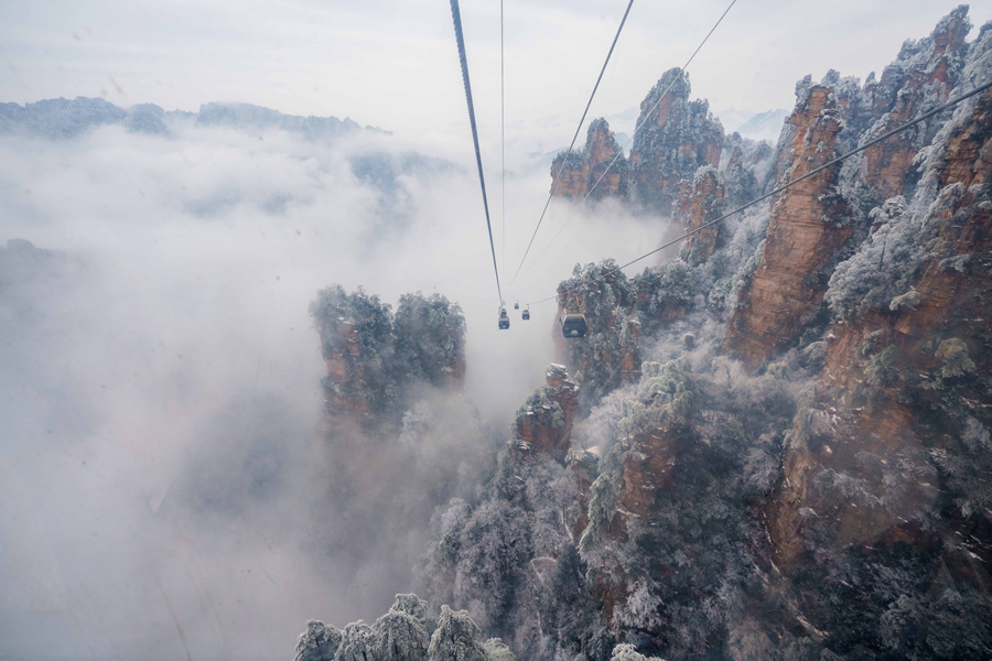 張家界武陵源には以前にも行ったことがあった。 今回は雪景色が見たくて冬に行ってみることにした。 でも公園內(nèi)に入っても全然雪はなく、殘念な気持ちになりながら天子山ロープウェイに乗り込んだ。 でも、少し乗っていると霞んだ雲(yún)を抜けて、急にこの景色が見えてきた。 黃色い巖肌と、真っ白な雪、そして、それを覆う雲(yún)海。 ロープウェイでこの空間をゆっくりと浮遊しているのは、まるで現(xiàn)実とは信じられないような、あまりに幻想的で美しい世界だった。 友達(dá)と自分は叫びながら大興奮し、一生忘れられない瞬間になった。