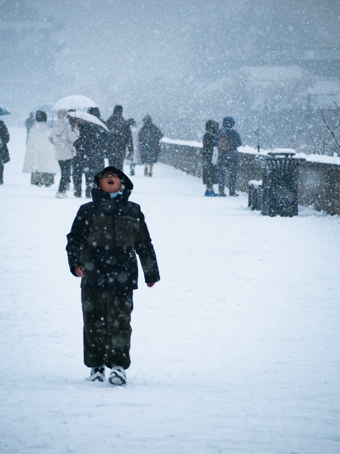 大雪が降った日の西安市の城壁。訪れた人々は思い思いに雪を楽しんでいた。