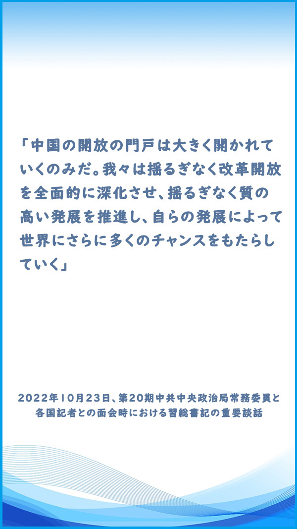 「中國の開放の門戸は大きく開かれていくのみだ。我々は揺るぎなく改革開放を全面的に深化させ、揺るぎなく質(zhì)の高い発展を推進し、自らの発展によって世界にさらに多くのチャンスをもたらしていく」