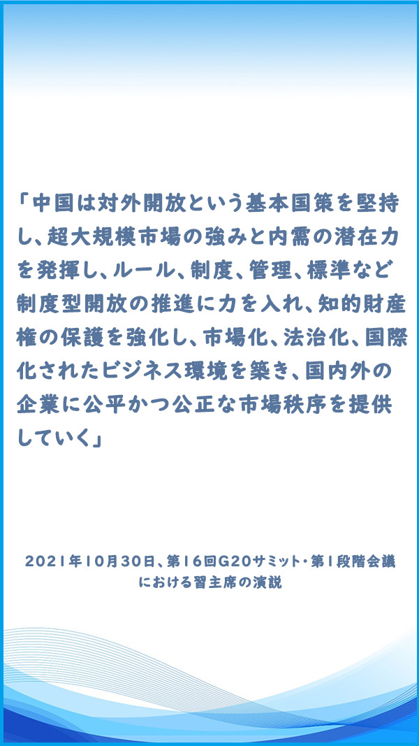 「中國は対外開放という基本國策を堅持し、超大規(guī)模市場の強みと內(nèi)需の潛在力を発揮し、ルール、制度、管理、標(biāo)準(zhǔn)など制度型開放の推進に力を入れ、知的財産権の保護を強化し、市場化、法治化、國際化されたビジネス環(huán)境を築き、國內(nèi)外の企業(yè)に公平かつ公正な市場秩序を提供していく」