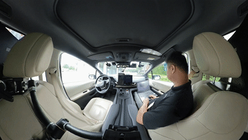 道路を走る自動運転テスト車両內(nèi)で車載機器の路上試験をする王偉さん(6月19日撮影)。