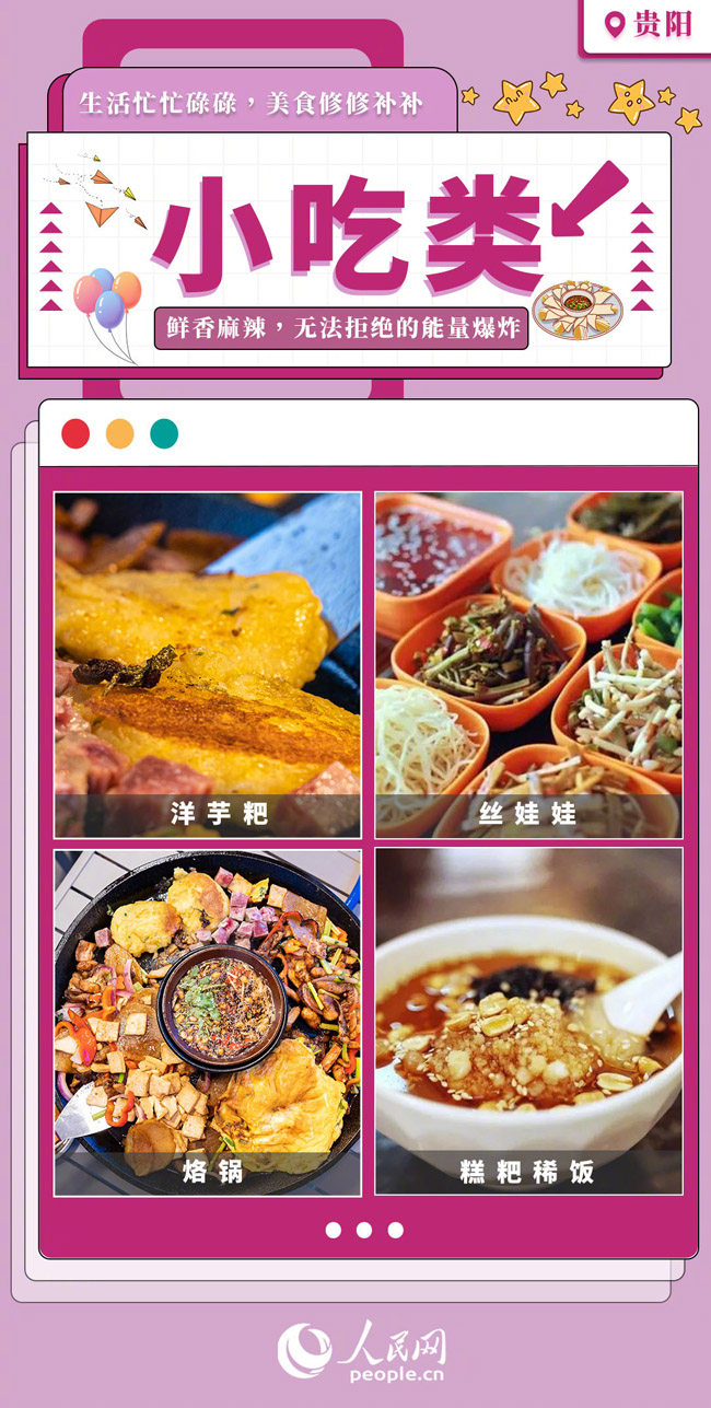 そして貴陽には食欲をそそるグルメが満載だ。鍋でグツグツ煮込まれた豚の內(nèi)臓がたっぷり入った「腸旺麺」のほか、揚(yáng)げた豆腐に薬味をたっぷり使った具を入れて食べる「豆腐果」、ハッシュドポテトのように鉄板で焼いた「洋芋粑」、米粉入りの餅(クレープ)に各種野菜などを巻いて、薬味をのせ、最後にスープを上からちょっと注いで食べる「絲娃娃」などを売る屋臺が並んでいる。