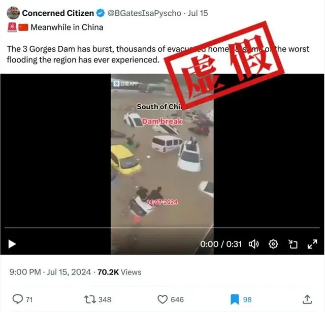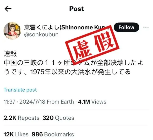 SNSのX(舊ツイッター)で最近、「中國の三峽の11ヶ所のダムが全部決壊し、1975年以來の大洪水が発生している」といったデマが拡散している。こうしたデマやフェイクニュースには、「三峽ダムが決壊し、數(shù)千世帯が避難した」とする長さ30秒ほどの動畫まで添えられている。