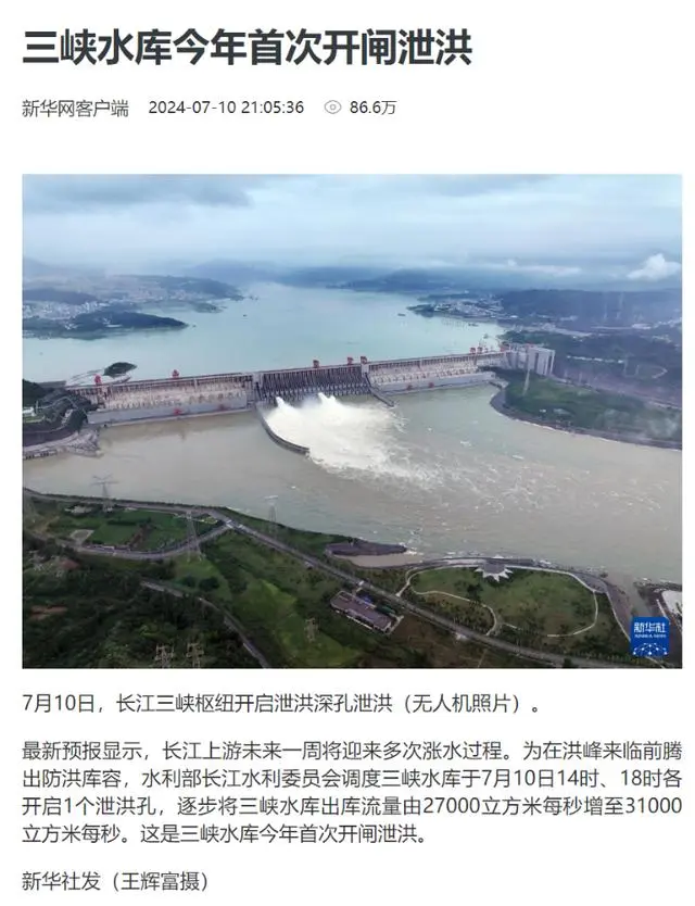 新華社の今月10日付の報道によると、7月に入り、長江上流の水位が上昇し続けると予想されているため、洪水のピークが到來する前に、貯水量の適切な調(diào)整を行う目的で、中國水利部(?。?長江水利委員會は、三峽ダムのゲートを今月10日午後2時と6時に、1門ずつ開いて放流を開始した。そして、放流量を1秒當たり2萬7000立方メートルから3萬1000立方メートルに少しずつ増やしていった。新華社が掲載しているドローンで撮影した寫真を見ると、三峽ダムは正常に放流を行っており、決壊など生じていない。