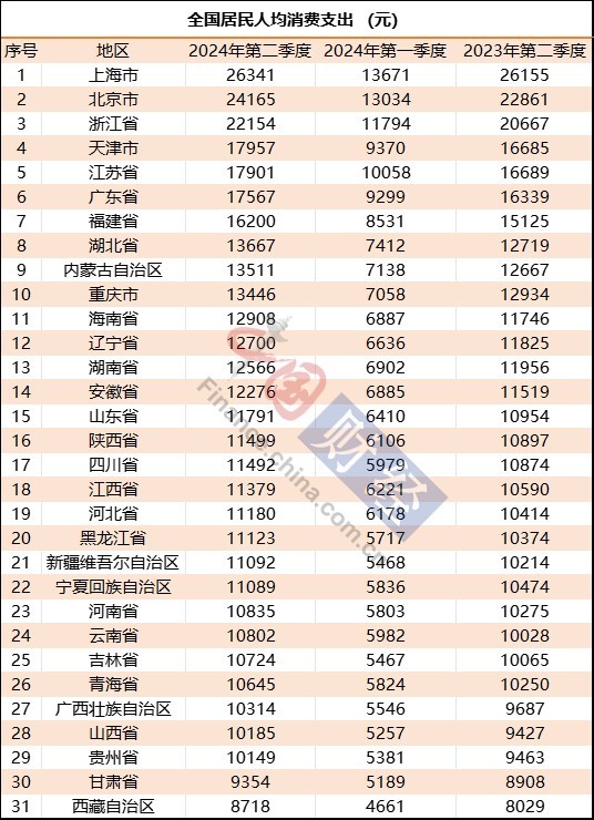 上海市、北京市、浙江省、天津市、江蘇省、広東省、福建省、湖北省の8省市の上半期一人當たり消費支出額が全國平均を上回った。最も消費したのは上海市民で一人當たり2萬6341元に達し、2位は北京の2萬4165元、3位は浙江の2萬2154元だった。