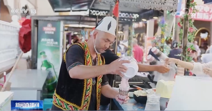 新疆維吾爾(ウイグル)自治區(qū)の夏の飲み物として欠かせないのが、「ドガップ(ヨーグルトのアイスドリンク)」。細かく砕いた氷に、ヨーグルトや蜂蜜、桑の実、ブドウを加え、お碗の中で軽くかき混ぜる。それからお碗の中身を高さ1~2メートルほど上に放り投げ、落ちてくる中身を再びお碗で受け止める。ひと目を引くこのパフォーマンスにより、ヨーグルトの酸味と蜂蜜の甘みがうまく混ざり合い、冷たくてスッキリとした味わいのアイスドリンクが出來上がる。(編集KN)