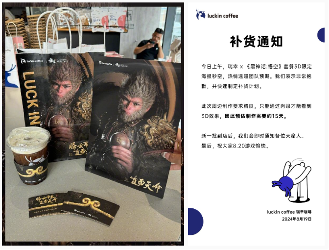 「悟空」はゲーム産業(yè)だけでなく、瑞幸珈琲(ラッキンコーヒー)ともコラボして新たな人気商品を生み出した。8月19日、両者はコラボ商品「黒神話騰雲(yún)アメリカーノ」を発売し、指定のセットを購入すると関連グッズを數(shù)量限定でプレゼントする企畫も打ち出した。グッズは発売されるとすぐに完売し、「瑞幸が黒神話悟空とコラボ」の話題も検索でトレンド入りした。