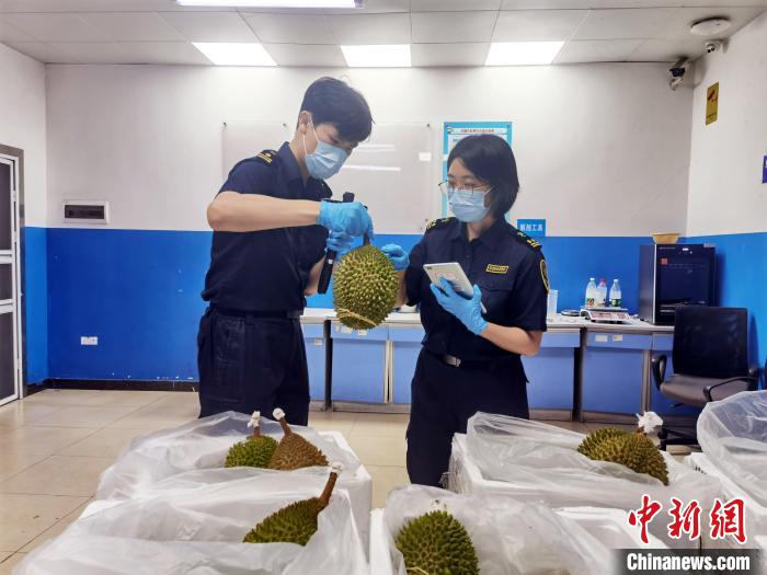 マレーシア産のムサンキングドリアンは、木で完熟してから収穫されるため、品質(zhì)保持期限が冷凍ドリアンより短く、物流のタイムパフォーマンスに対してより要求が高い。生鮮食品の安全で効率的な通関を保証するため、広州白雲(yún)空港稅関は自発的に関連企業(yè)と連攜し、第1陣となるマレーシア産生ドリアンの輸出計(jì)畫を理解し、通関全フローの業(yè)務(wù)指導(dǎo)を提供し、植物検疫専門家による貨物検査を手配した。