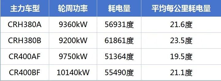 「中國の高速列車が1キロ走行するのに1萬ワット時の電力を消費している」という説は、事実をすり替えている?,F(xiàn)有の8両編成の「CRH380A」や「CRH380B」、「CR400AF」、「CR400BF」といった主力車両の出力(output power at wheel rim)は、それぞれ9360kW、9200kW、9750kW、1萬140kWとなっている。一方、北京市と上海市を結(jié)ぶ「京滬高速鉄道」(往復(fù)2636キロ)が時速350キロで走行した場合の電力消費量テストデータによると、その電力消費量はそれぞれ5萬6931ワット時、6萬1861ワット時、5萬1364ワット時、5萬5490ワット時となっている。これらを基に計算すると、1キロ當たりの平均電力消費量はそれぞれ21.6ワット時、23.5ワット時、19.5ワット時、21.1ワット時となる。