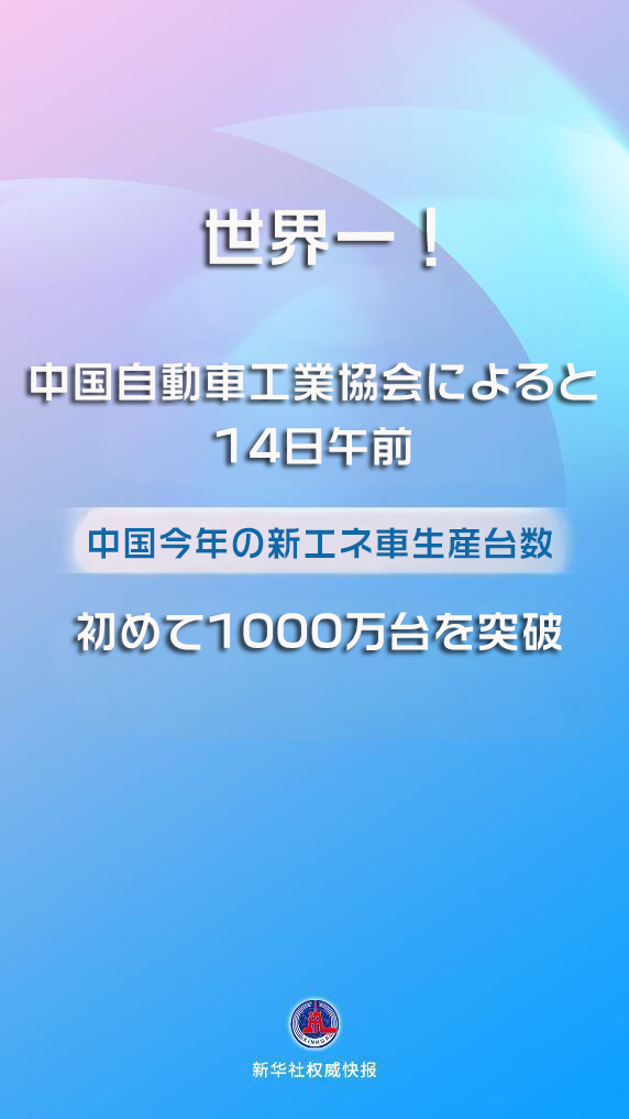 中國自動(dòng)車工業(yè)協(xié)會によると、14日午前、中國の今年の新エネ車生産臺數(shù)が初めて1000萬臺を超えた。新エネ車の年間生産臺數(shù)が1000萬臺を超えるのは世界でも初めてだ。