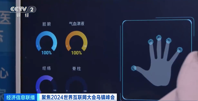 會場に展示されていた手のひらよりも少し大きなサイズのスマート中醫(yī)學(xué)測定器には、ビッグデータやAI、中醫(yī)學(xué)大規(guī)模AIモデルが採用され、中醫(yī)學(xué)診療のデジタル化を?qū)g現(xiàn)している。測定器に2分ほど手を置いておくと、バックグラウンドシステムが、體のデータを収集し、健康診斷を受けることができる。