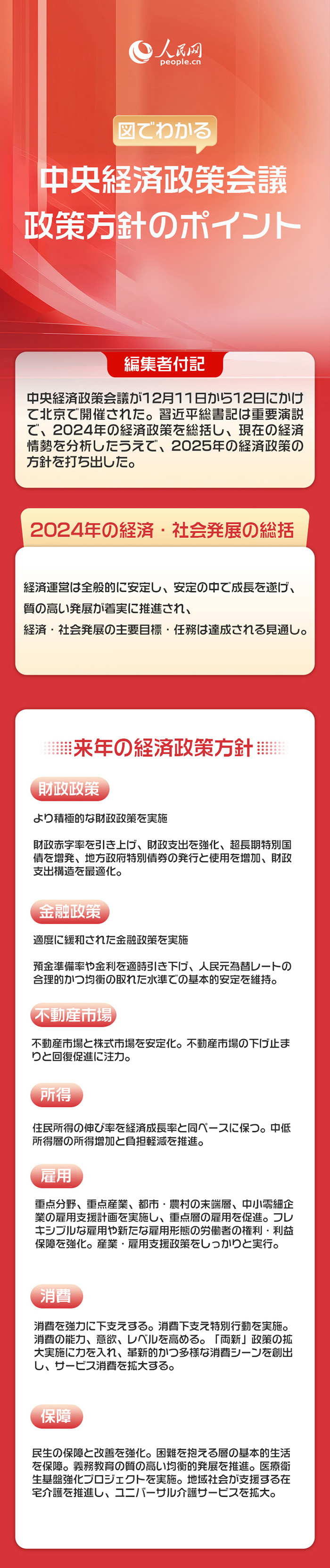 中央経済政策會(huì)議が12月11日から12日にかけて北京で開(kāi)催された。習(xí)近平総書(shū)記は重要演説で、2024年の経済政策を総括し、現(xiàn)在の経済情勢(shì)を分析したうえで、2025年の経済政策の方針を打ち出した。