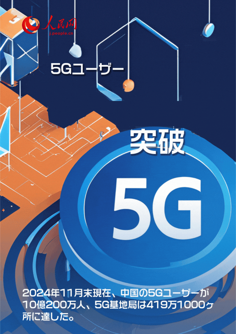 2024年、中國は5Gの構(gòu)築において重大な発展を遂げた。2024年11月末現(xiàn)在、中國の5Gユーザーが10億200萬人に達(dá)し、攜帯電話ユーザー全體に占める割合は前年末比9.4ポイント上昇の56%となった。5G基地局は前年末比81萬5000ヶ所増の419萬1000ヶ所に達(dá)した。