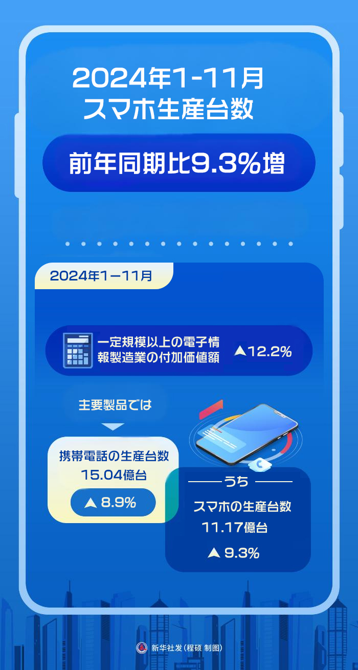 中國2024年1-11月のスマホ生産臺(tái)數(shù)、前年同期比9.3%増