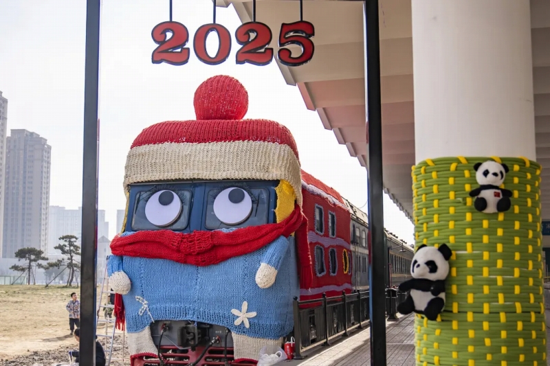 河北省石家荘市の解放広場の近くには、赤や青などカラフルな色合いのセーターを著て、毛糸の帽子をかぶった可愛らしい列車がある。