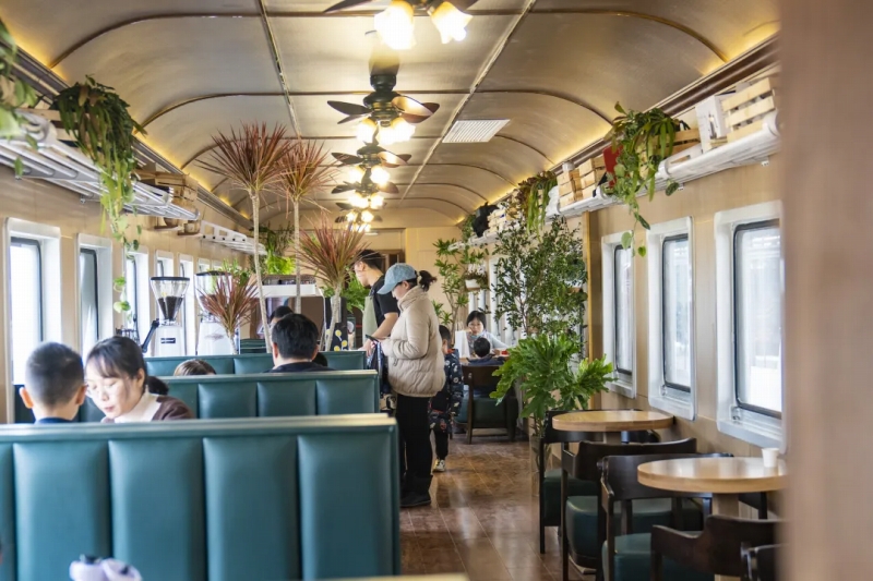 8両編成の「緑皮車」は、各車両がカフェや書店などにリニューアルされ、市民が楽しめる新たな人気スポットとなっている。(編集YF)