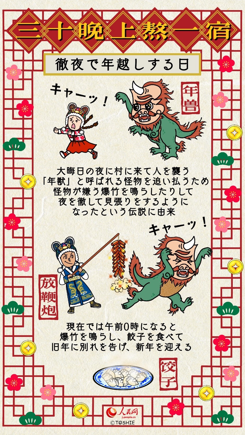 これは大晦日の夜になると、村に來て人を襲う「年獣」と呼ばれる怪物を追い払うため、人々が夜を徹して見張りをするようになったという伝説に由來している。この「年獣」は、光や甲高い音を嫌うため、大晦日には、ランタンを飾ったり、焚火をしたり、爆竹を鳴らしたりして、怪物を追い払ったといわれている。