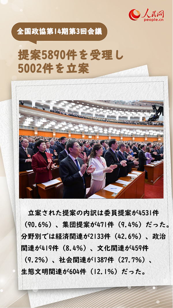 中國人民政治協(xié)商會議第14期全國委員會(全國政協(xié))第3回會議の10日の閉幕會議において、3月5日午後8時までに受理した提案が5890件に上ったことが明らかにされた?!钢袊嗣裾螀f(xié)商會議全國委員會提案作業(yè)條例」及び提案審査作業(yè)細則に基づき、審査の結(jié)果5002件が立案され、262件が併案され、626件が意見?提議として処理された。