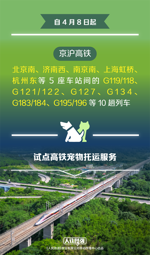 8日から、ペット預(yù)かりサービスが試験的に導(dǎo)入される列車は、京滬高速鉄道の北京南駅や済南西駅、南京南駅、上海虹橋駅、杭州東駅など5駅の間を走るG119/118、G121/122、G127、G134、G183/184、G195/196など10本となっている。