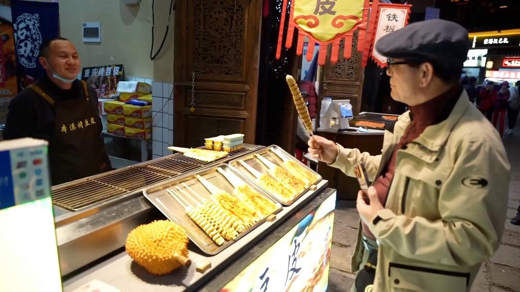 湖南省張家界市の観光スポット?七十二奇樓は夜になると、ライトアップされて美しく輝く。レトロな雰囲気を漂わせるグルメ街で、韓國人観光客の趙載鉉さんは、スマホを使って決済を済ませ、お気に入りの軽食を食べながら、「張家界観光がどんどん便利になっている」と話していた。