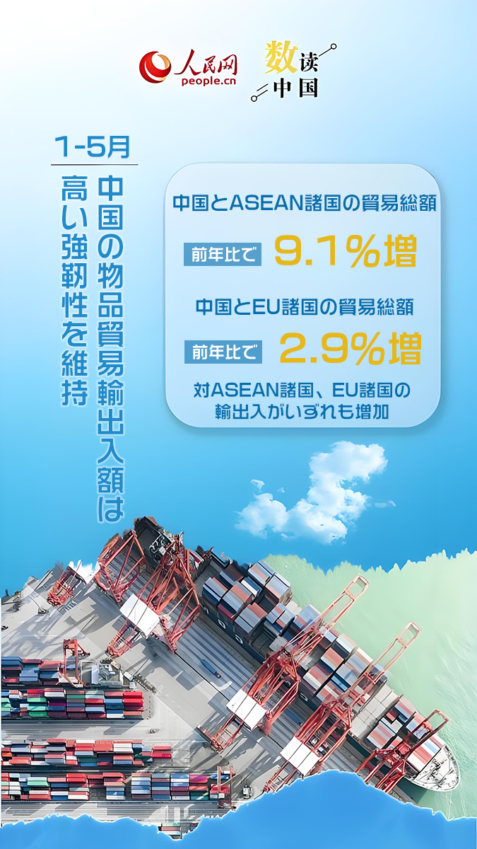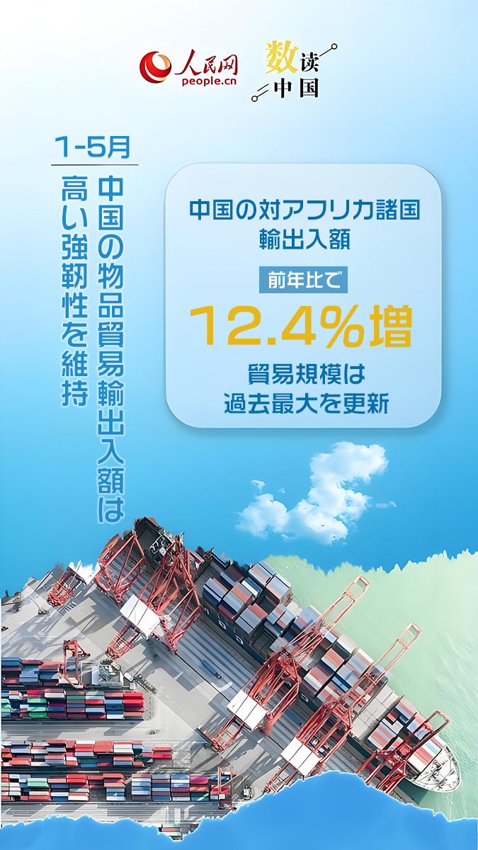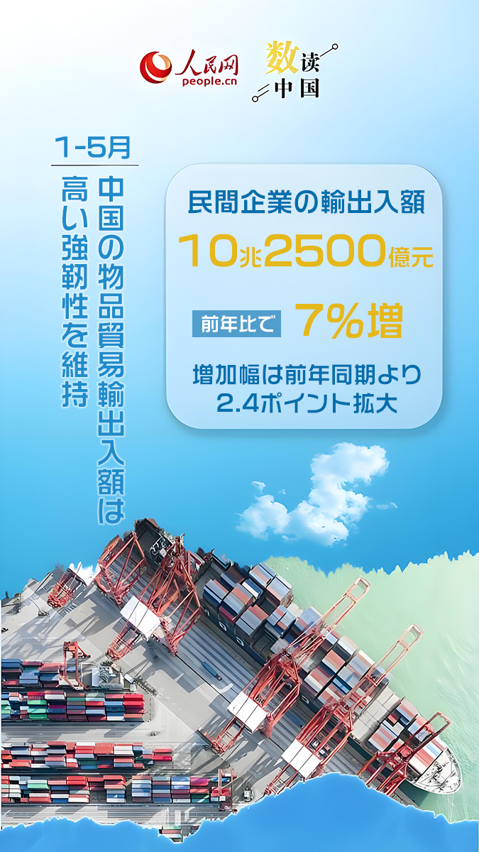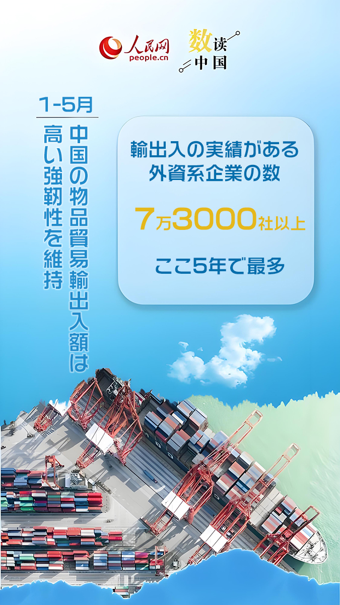 今年1-5月における中國の物品貿(mào)易輸出入総額は、前年同期比2.5%増の17兆9400億元(1元は約20.1円)だった。輸出入の実績がある外資系企業(yè)の數(shù)はここ5年で最多となり、民間企業(yè)の輸出入の増加ペースが加速し、中國?アフリカ間の貿(mào)易規(guī)模が過去最大となり、設備?製造業(yè)、電気機械製品の輸出が好調(diào)となった。全體的に見て、中國の1-5月の貿(mào)易は、高い強靭性を維持した。