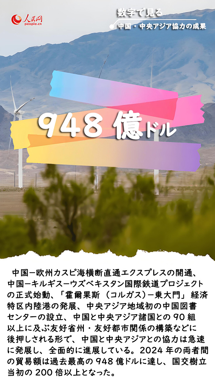 中國-歐州カスピ海橫斷直通エクスプレスの開通、中國-キルギス-ウズベキスタン國際鉄道プロジェクトの正式始動(dòng)、「霍爾果斯(コルガス)-東大門」経済特區(qū)內(nèi)陸港の発展、中央アジア地域初の中國図書センターの設(shè)立、中國と中央アジア諸國との90組以上に及ぶ友好省州?友好都市関係の構(gòu)築などに後押しされる形で、中國と中央アジアとの協(xié)力は急速に発展し、全面的に進(jìn)展している。2024年の両者間の貿(mào)易額は過去最高の948億ドル(1ドルは約145.0円)に達(dá)し、國交樹立當(dāng)初の200倍以上となった。(出典:人民日?qǐng)?bào)、新華社)