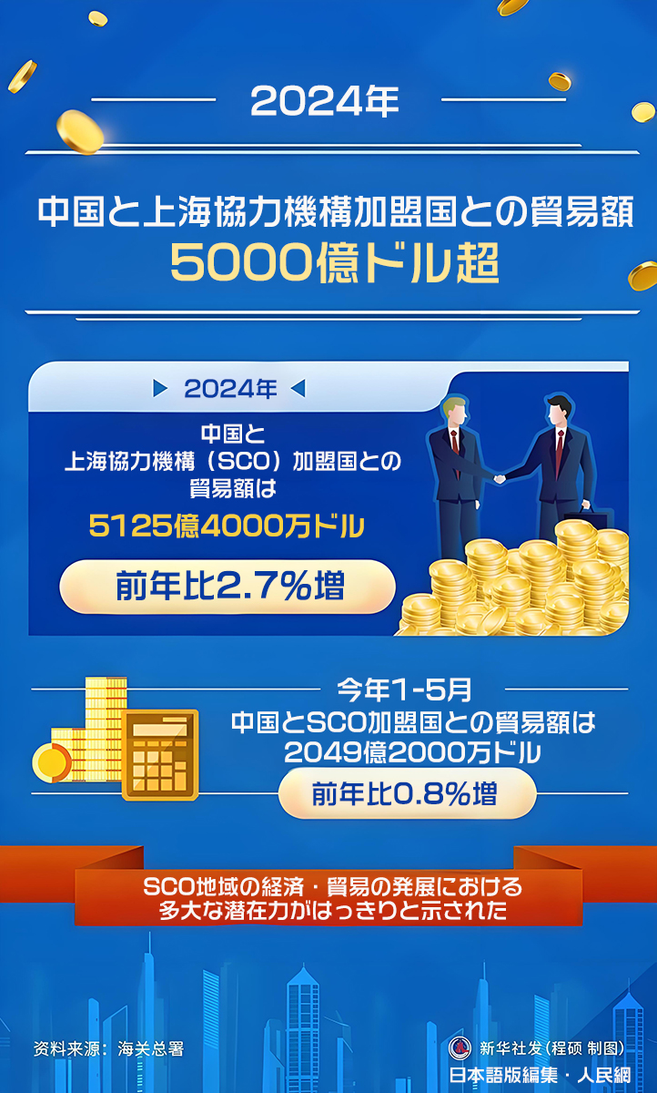 中國(guó)稅関総署が2日に発表した統(tǒng)計(jì)によると、2024年の中國(guó)と上海協(xié)力機(jī)構(gòu)(SCO)加盟國(guó)との貿(mào)易額は5125億4000萬(wàn)ドル(1ドルは約144.6円)に達(dá)し、前年比で2.7%増加した。また、今年1-5月の貿(mào)易額は2049億2000萬(wàn)ドルで、前年比で0.8%増加し、SCO地域の経済?貿(mào)易の発展における多大な潛在力がはっきりと示された。