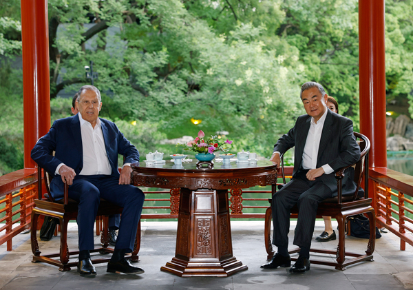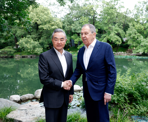 王氏は、ラブロフ外相が上海協(xié)力機(jī)構(gòu)(SCO)外相會議に出席するために來中したことを歓迎し、「中露関係は現(xiàn)在の世界において最も安定し、最も成熟した、最も戦略的価値を有する大國間関係だ。両國は常に歴史的な深み、戦略的な高み、長期的な視點(diǎn)から各分野における両國の協(xié)力を捉え、推進(jìn)してきた。両國外相による緊密な接觸の維持は、両國首脳間の合意の速やかな実行に寄與する。共に今後の上層部交流の準(zhǔn)備を整え、包括的な戦略的協(xié)力を深化させ、各々の発展と振興を促進(jìn)し、激動と変革の最中にある世界がもたらす試練に対処することが、目下の重點(diǎn)だ」と指摘。