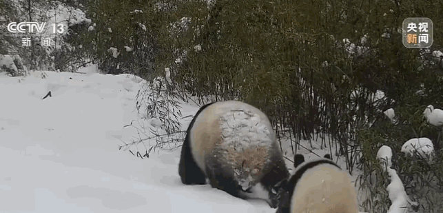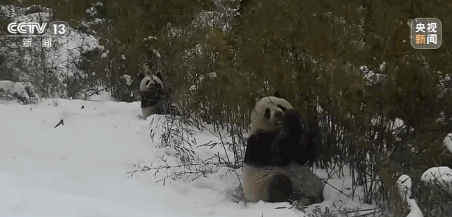 ほかにも、パンダの親子が雪の中を歩いている様子を捉えた映像もある。2頭のパンダがお尻を振りながら歩く様子はなんとも可愛らしい。その後、お母さんパンダは座って竹を食べ始め、それを見た赤ちゃんパンダも真似して座り、竹をおいしそうに食べ始めている。