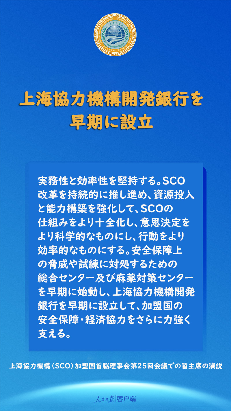 習(xí)主席は「実務(wù)性と効率性を堅持する。SCO改革を持続的に推し進め、資源投入と能力構(gòu)築を強化して、SCOの仕組みをより十全化し、意思決定をより科學(xué)的なものにし、行動をより効率的なものにする。安全保障上の脅威や試練に対処するための総合センター及び麻薬対策センターを早期に始動し、上海協(xié)力機構(gòu)開発銀行を早期に設(shè)立して、加盟國の安全保障?経済協(xié)力をさらに力強く支える」と述べた。(編集NA)