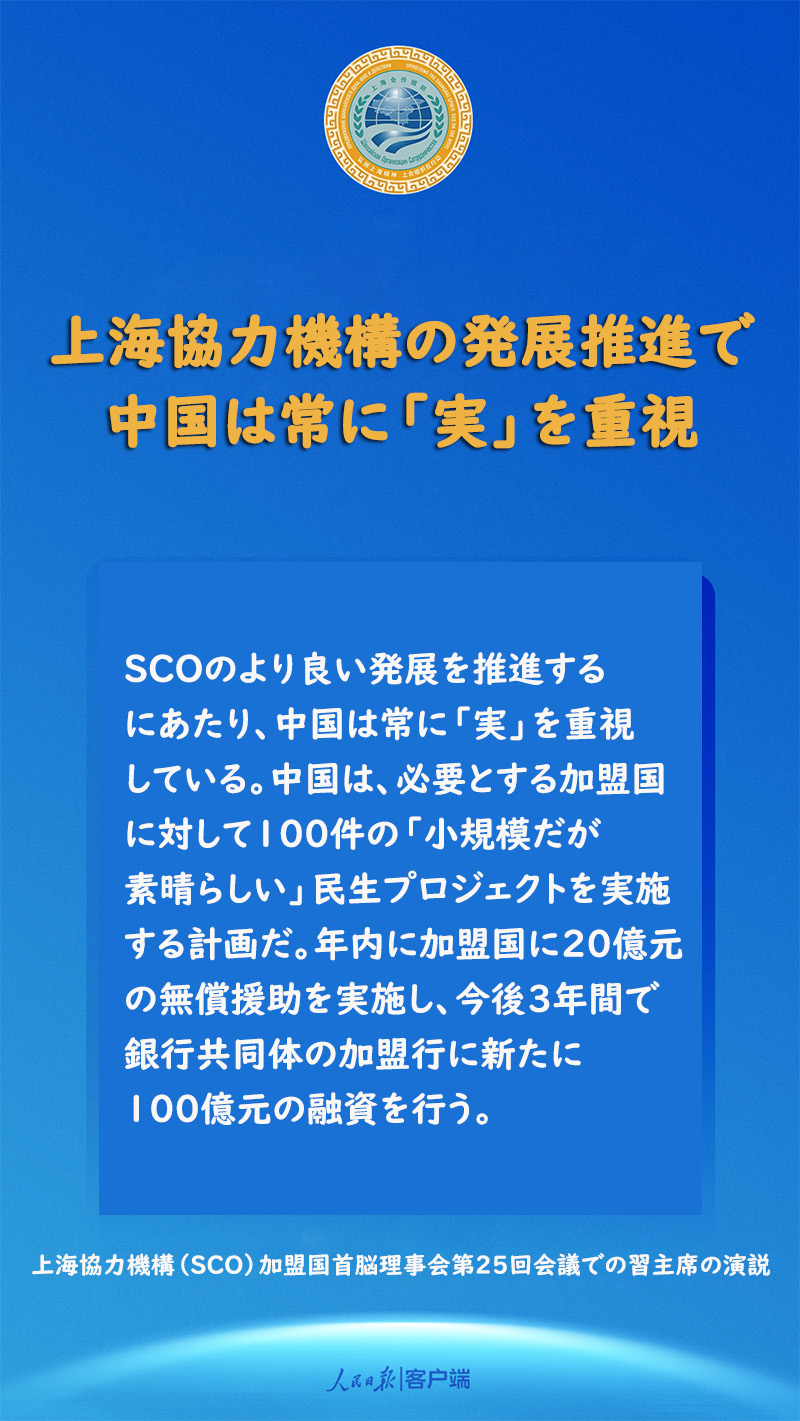 習(xí)主席は「SCOのより良い発展を推進(jìn)するにあたり、中國は常に『実』を重視している。中國は、必要とする加盟國に対して100件の『小規(guī)模だが素晴らしい』民生プロジェクトを?qū)g施する計(jì)畫だ。年內(nèi)に加盟國に20億元(1元は約20.7円)の無償援助を?qū)g施し、今後3年間で銀行共同體の加盟行に新たに100億元の融資を行う。來年からは、既存の枠組みを踏まえてSCO特別奨學(xué)金の定員を倍増し、『SCO博士課程革新育成計(jì)畫』を?qū)g施して、學(xué)術(shù)?科學(xué)研究分野の卓越した人材を共に育成する。今後5年間で、加盟國に『魯班工坊』を10ヶ所設(shè)置し、1萬人に人材研修?教育の機(jī)會(huì)を提供する」と述べた。(編集NA)