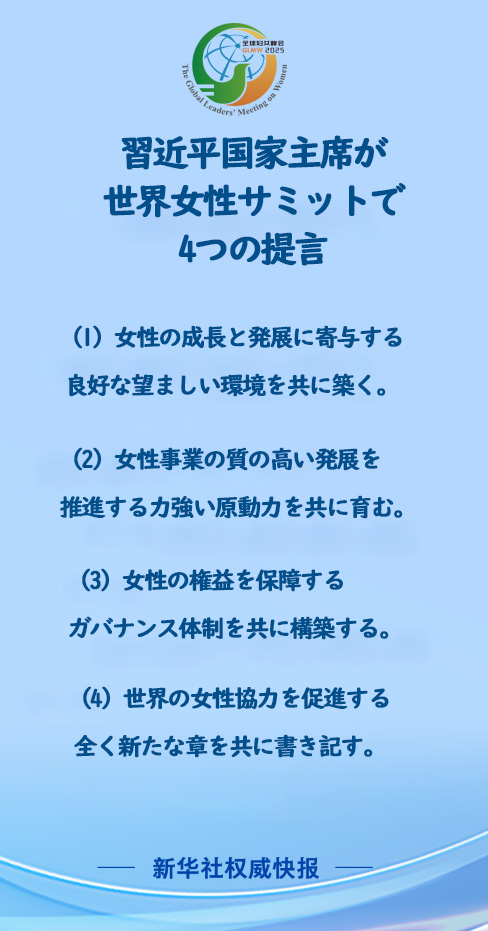 習(xí)主席は「未來を展望すると、我々は北京での世界女性會(huì)議の初心に立ち返り、女性の全面的な発展を加速させる新たなプロセスに向けて、より広範(fàn)な共通認(rèn)識(shí)を形成し、より広い道を切り開き、より実務(wù)的な行動(dòng)を取る必要がある」と指摘し、次の4點(diǎn)を提言した。