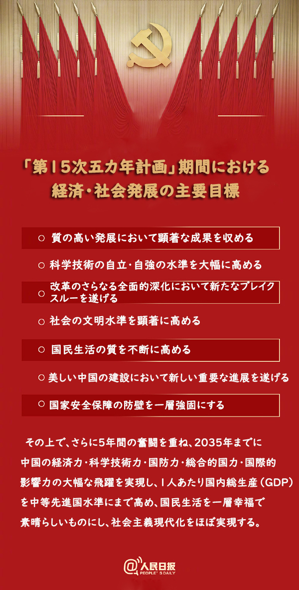 會議は「第15次五カ年計畫」期間における経済?社會発展の主要目標(biāo)として「質(zhì)の高い発展において顕著な成果を収め、科學(xué)技術(shù)の自立?自強(qiáng)の水準(zhǔn)を大幅に高め、改革のさらなる全面的深化において新たなブレイクスルーを遂げ、社會の文明水準(zhǔn)を顕著に高め、國民生活の質(zhì)を不斷に高め、美しい中國の建設(shè)において新しい重要な進(jìn)展を遂げ、國家安全保障の防壁を一層強(qiáng)固にする」ことを掲げた。