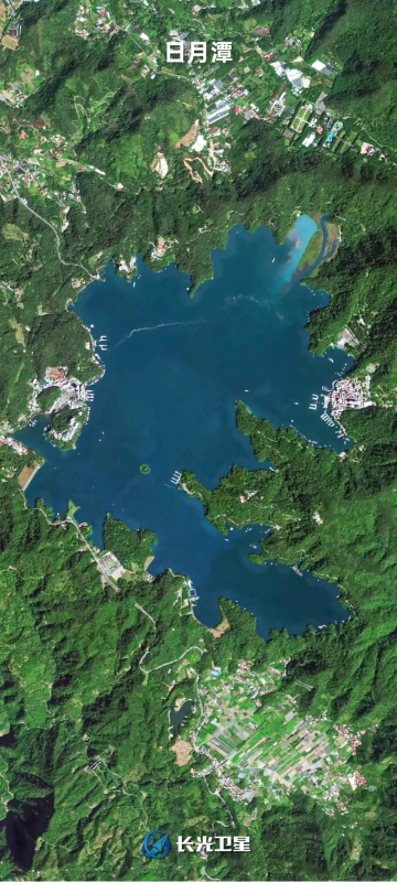 上空から湖「日月潭」を見ると、湖の北側(cè)の太陽(日)の形と南側(cè)が月の形をはっきりと見てとれる。