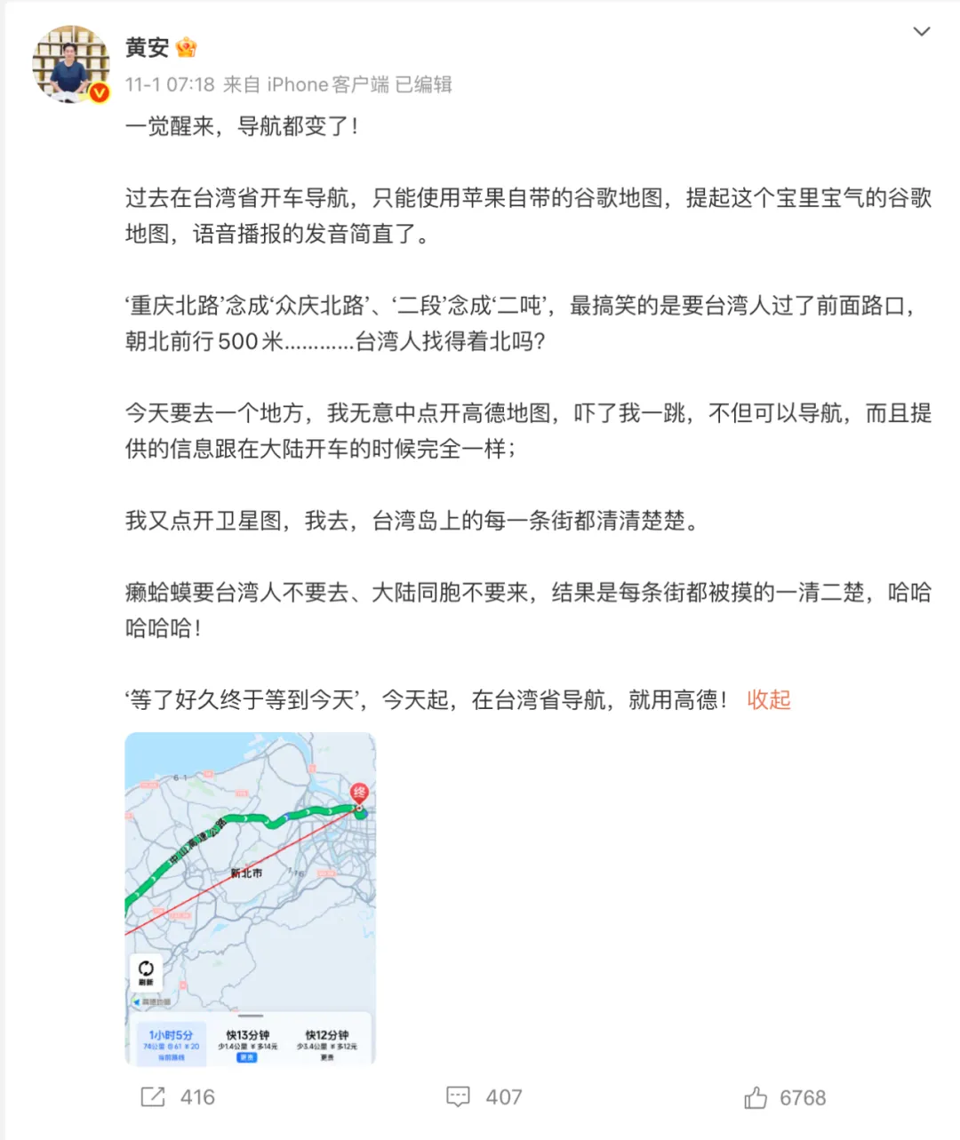 黃安は、「これまで、臺灣で車を運転する時は、アップルのスマホについているグーグルマップしか使えなかった。でも、音聲は発音が悪く、『重慶北路』を『衆(zhòng)慶北路』と言ったり、『二段』を『二噸』と言ったりする」と投稿。