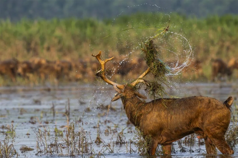 石首シフゾウ國家級自然保護(hù)區(qū)で、のんびりと過ごすシフゾウ(撮影?雷剛)。